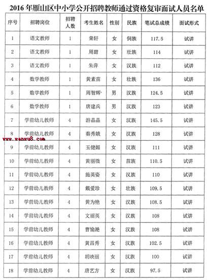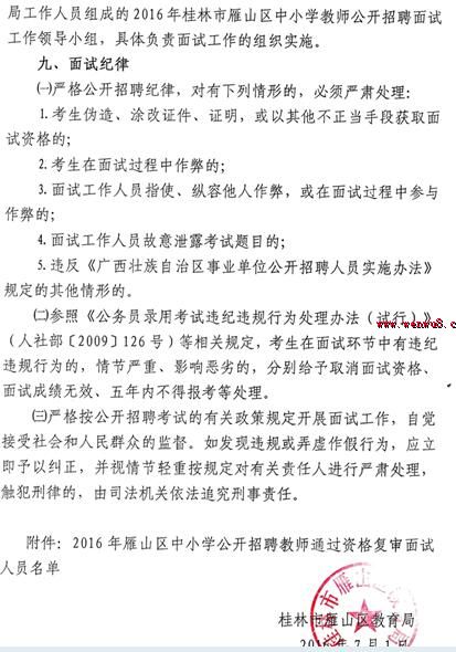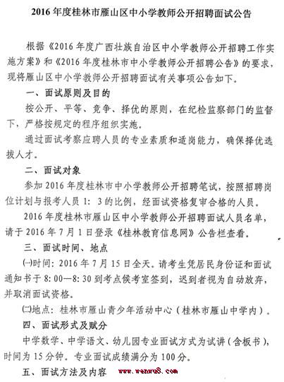 2016年廣西桂林市雁山區教師招聘面試公告(6月30日)