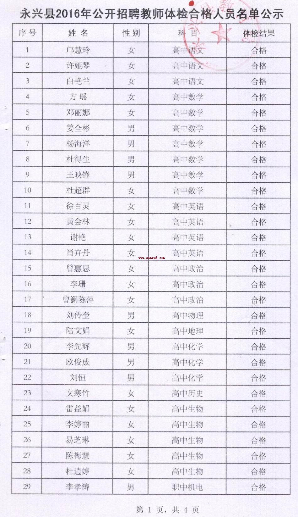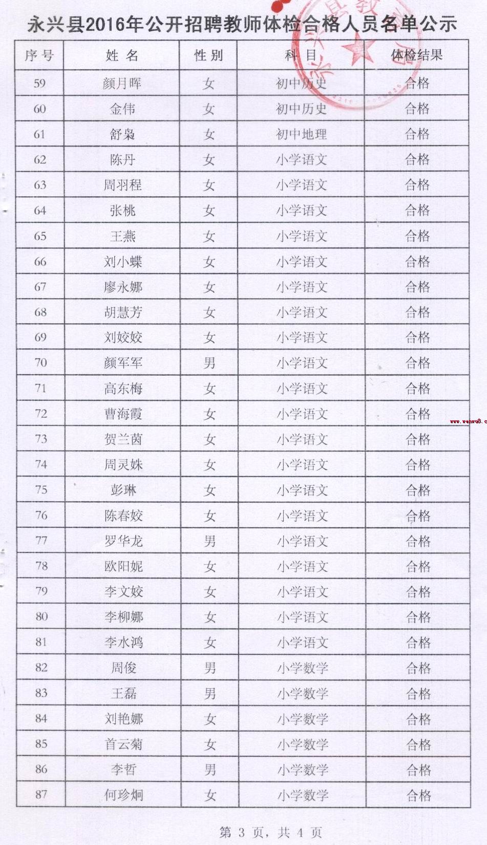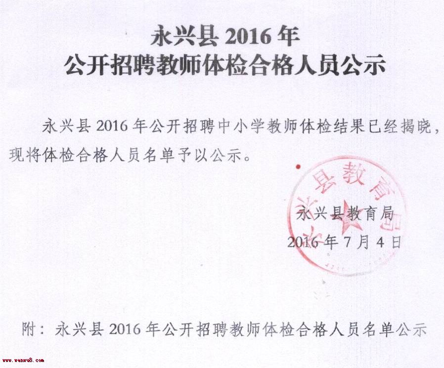 2016年湖南省郴州市永興縣教師招聘體檢合格人員公示