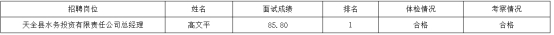 根據《天全縣國有資產管理服務中心天全縣水利局關于面向社會公開選聘天全縣水務投資有限責任公司總經理的公告》,經報名、資格審查、面試、體檢、考察等程序,現將以下擬聘用人員予以公示: