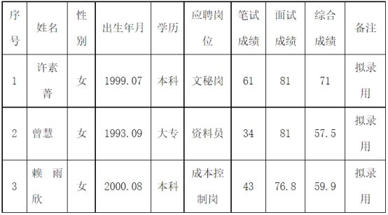 會昌縣興會科技創新集團責任有限公司對應聘人員組織現場筆試、面試,現將招聘擬錄入用名單公示如下: