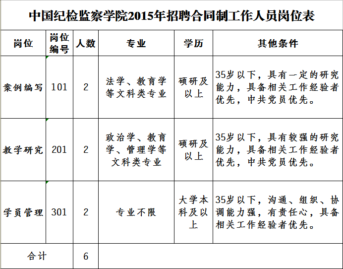 此次計劃招聘工作人員6名,具體見《中國紀檢監察學院2015年招聘合同制工作人員崗位表》。