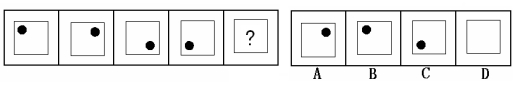 (答案:B。黑點(diǎn)在正方形中順時(shí)針移動(dòng)。在第5個(gè)圖形中,應(yīng)該正好移動(dòng)到左上角。)