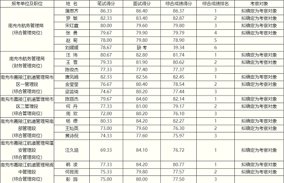 南充市航務管理局及所屬單位2022年公開遴選(考調)工作人員面試工作已結束,根據《南充市航務管理局及所屬單位2022年公開遴選(考調)工作人員公告》有關規定(考生未在規定時間內領取面試通知書的,視為自動放棄,由此出現的缺額按照筆試成績從高到低依次遞補;未在規定時間內到達指定地點參加面試的,視為自動放棄,由此出現的缺額不予遞補)。根據考試總成績和遴選(考調)名額,按2:1差額確定考察對象(名額在2人以上的職位,名額之比不低于1.5:1),考察有關事宜另行通知。現將考生考試成績及考察對象公告如下。