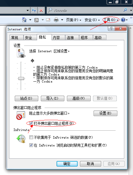 為了報名操作能夠順利進行,請使用IE瀏覽器(Internet Explorer)。調整瀏覽器屬性,關閉彈出窗口阻止程序:打開瀏覽器,在“工具”菜單的“Internet選項”中選擇“隱私”選項卡,將“打開彈出窗口阻止程序”前面的勾取消,然后點【應用】。