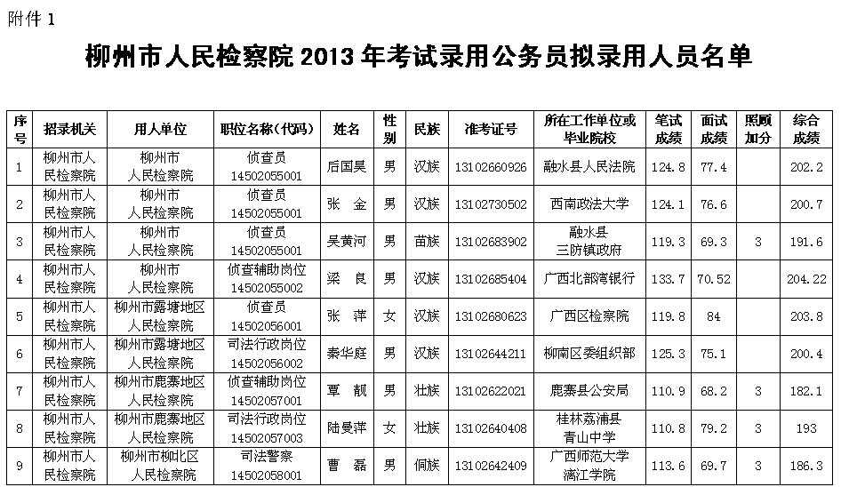 附件:1、柳州市人民檢察院2013年考試錄用公務員擬錄用人員名單