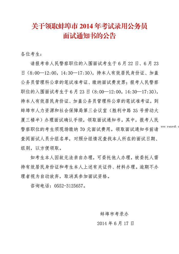 2014年安徽省蚌埠公務員面試通知書領取通知
