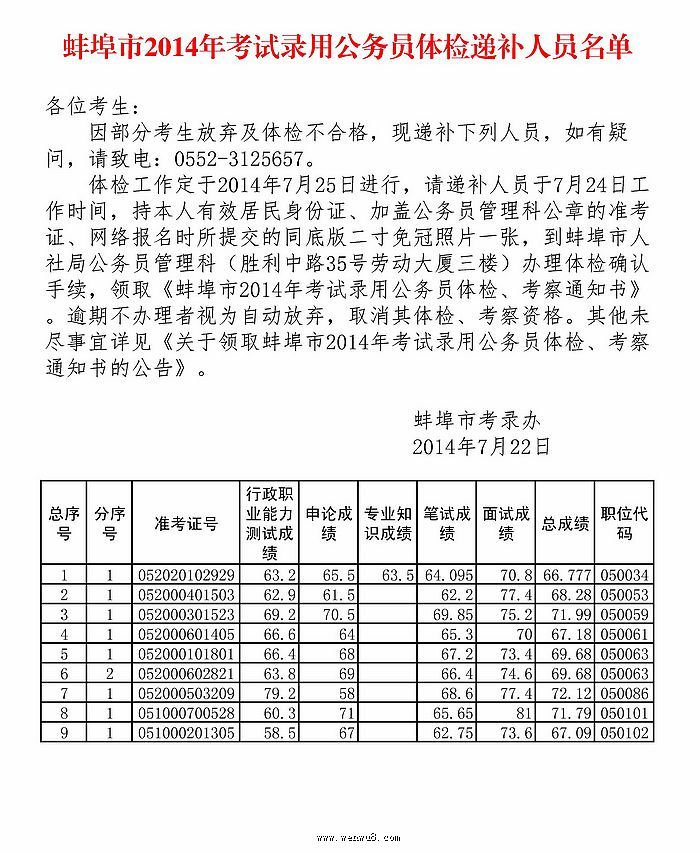 2014年安徽蚌埠公務員考試體檢遞補人員名單