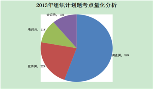 2013年省考里邊的組織計劃類試題主要包括以下幾個方面:調查類、宣傳類、培訓類、會議類,下邊給出此類試題的量化分析。