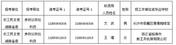根據省委組織部、省人力資源和社會保障廳、省公務員局《湖南省2014年考試錄用公務員公告》的有關規定,經報名、筆試、資格審查、面試、體檢、考察等程序,確定2014年中國農工民主黨湖南省委員會考試錄用公務員擬錄用人員名單: