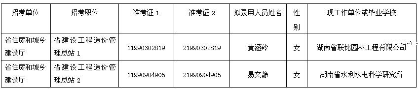根據省委組織部、省人力資源和社會保障廳、省公務員局《湖南省2014年考試錄用公務員公告》的有關規定,經報名、筆試、資格審查、面試、體檢、考察等程序,確定2014年湖南省住房和城鄉建設廳考試錄用公務員擬錄用人員名單:
