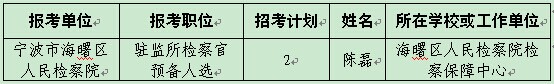 根據《2014年寧波市海曙區機關考試錄用公務員公告》規定,經過筆試、資格復審(體能測評)、面試、體檢和考察等程序,確定陳磊為第二批擬錄用人員。現將擬錄用人員情況公示如下: