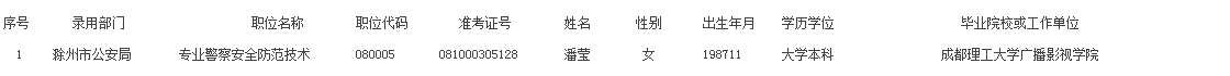 根據(jù)《滁州市2014年考試錄用公務(wù)員工作實施方案》(滁人社發(fā)〔2014〕50號)等規(guī)定,報考滁州市公安局的考生潘瑩,經(jīng)報名、筆試、面試、體檢與考察等程序,符合本次考試錄用條件,擬錄用為公務(wù)員。現(xiàn)向社會公示7天,節(jié)假日順延。公示期間如有問題,請及時向市委組織部、市人社局反映。監(jiān)督聯(lián)系電話:市委組織部干部綜合科0550-3044060、市人社局公務(wù)員管理辦公室0550-3022415.