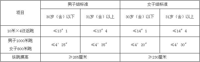 體能測評按照人力資源社會保障部、公安部、國家公務員局聯合頒布的《關于印發公安機關錄用人民警察體能測評項目和標準(暫行)的通知》(人社部發〔2011〕48號)執行。