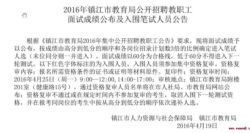 2016年江蘇省鎮江市教師招聘面試成績公布及入圍筆試人員公告