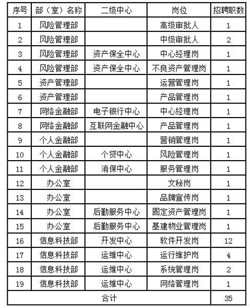 1.應(yīng)聘風險管理部高級審批人、中級審批人、資產(chǎn)保全中心中心經(jīng)理崗以及網(wǎng)絡(luò)金融部電子銀行中心中心經(jīng)理崗位的要求1972年1月1日之后出生(45周歲及以下),應(yīng)聘其它崗位的要求1982年1月1日之后出生(35周歲及以下)。