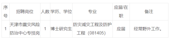 為加強天津市地震局專業技術隊伍建設,進一步增強服務天津經濟社會發展的能力,根據《事業單位人事管理條例》《事業單位公開招聘人員暫行規定》《中國地震局進人管理辦法》和《天津市地震局公開招聘事業單位人員辦法(試行)》等有關規定,現補充招聘事業單位工作人員,有關事項公告如下: