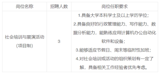 崗位名稱:非學歷培訓項目管理崗,招聘項目制工作人員共3人,采用人才派遣方式錄用。詳見下表。