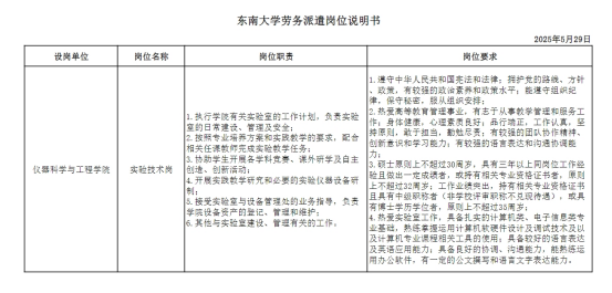 具體崗位名稱、崗位職責及招聘要求詳見《東南大學勞務派遣崗位說明書》。