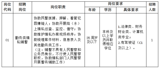 因工作需要,江陰海關緝私分局面向社會公開招聘輔警1人,現將有關事項公告如下: