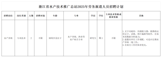 浙江省水產技術推廣總站(浙江省漁業檢驗檢測與疫病防控中心)為浙江省農業農村廳直屬公益一類事業單位,機構規格相當于正處級。因工作需要,經研究決定,向社會公開招聘勞務派遣工作人員2名,辦公地點位于杭州市余杭區現將有關事項公告如下:
