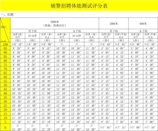 應(yīng)聘人員通過資格初審后需參加體能測試,項目包括:縱跳摸高和長跑(男1000米、女800米),標(biāo)準(zhǔn)參照《公安機(jī)關(guān)錄用人民警察體能測試項目和標(biāo)準(zhǔn)(試行)》。體能測試任何一項不合格不得進(jìn)入下一環(huán)節(jié),體能測試總分=縱跳摸高成績50%+長跑成績50%。測試時間和地點(diǎn)另行通知。