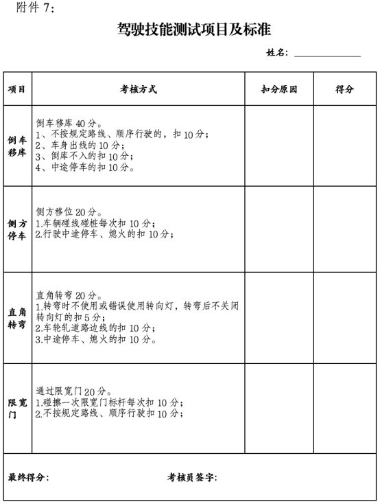 (四)駕駛技能測(cè)試(僅駕駛員參加)。共4個(gè)項(xiàng)目,分別為倒車入庫(kù)、側(cè)方停車、直角轉(zhuǎn)彎、限寬門,駕駛技能測(cè)試滿分100分,成績(jī)低于60分的不得進(jìn)入下一環(huán)節(jié)。《駕駛技能測(cè)試項(xiàng)目及標(biāo)準(zhǔn)》(詳見(jiàn)附件7)。