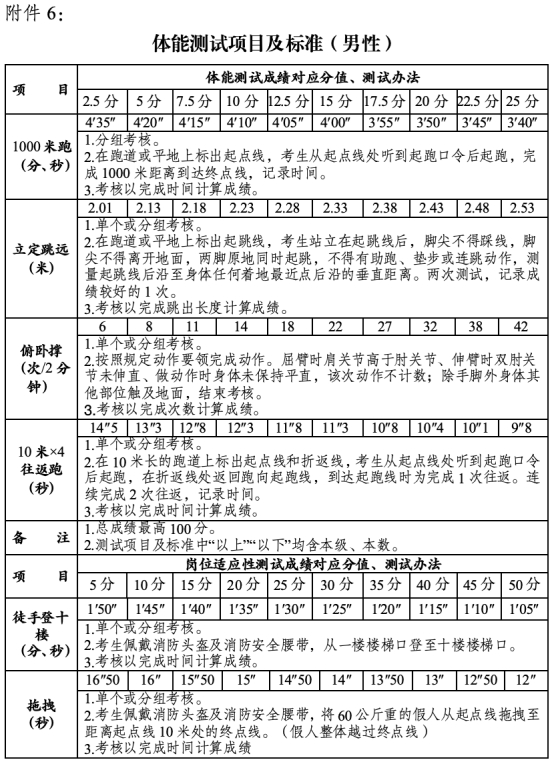 2、崗位適應(yīng)性測(cè)試(僅專職隊(duì)員參加)。共2個(gè)項(xiàng)目,分別為徒手登10樓和拖拽,崗位適應(yīng)性測(cè)試滿分100分,成績(jī)低于60分的不得進(jìn)入下一環(huán)節(jié)。《體能測(cè)試、崗位適應(yīng)性測(cè)試項(xiàng)目及標(biāo)準(zhǔn)》(詳見(jiàn)附件6)。