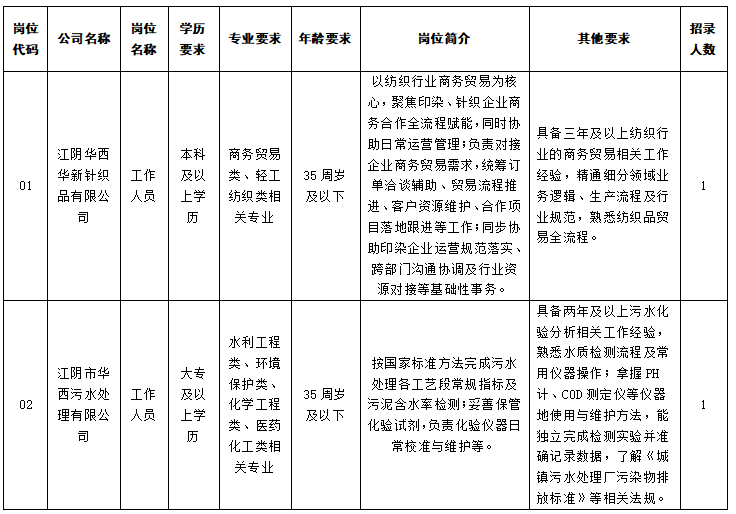 江陰市華士鎮下屬國資公司因發展需要,決定面向社會公開招聘工作人員2名。現將有關事項公布如下:
