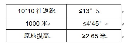 體能素質(zhì)測評的項(xiàng)目及合格標(biāo)準(zhǔn)如下: