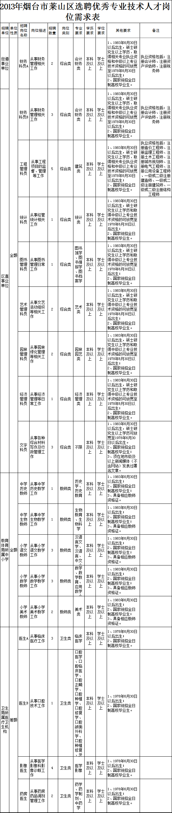 為適應區域經濟社會發展,按照《事業單位公開招聘人員暫行規定》(人事部令第6號)、《山東省事業單位公開招聘人員實施辦法》(魯人發〔2006〕23號)、《煙臺市事業單位公開招聘人員實施細則(試行)》(煙人〔2007〕58號)以及國家、省、市有關法律法規和政策規定,2013年煙臺市萊山區擬面向社會選聘40名工作人員(崗位要求詳見附表)。現公告如下: