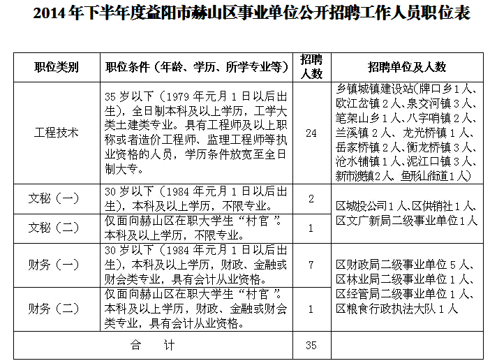 本次共招聘事業(yè)單位工作人員35名,均為全額撥款事業(yè)編制職位(詳見附件:《2014年下半年度益陽市赫山區(qū)事業(yè)單位公開招聘工作人員職位表》)。