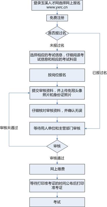 網(wǎng)絡(luò)報名的大致流程為:登錄玉溪人才網(wǎng)→網(wǎng)上報名入口→注冊→查看招聘崗位→按崗位報名并填寫報名資料→等待審核→審核通過→網(wǎng)上交費(注意查看交費狀態(tài),確認(rèn)交費成功)→打印筆試準(zhǔn)考證(打印時間在筆試公告內(nèi)另行通知)→參加筆試。