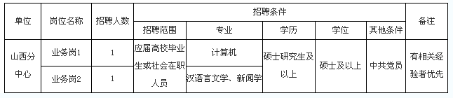 山西分中心的招聘崗位、人數、條件等詳見《崗位需求表》。 報考人員可以通過以下網站查閱《崗位需求表》: