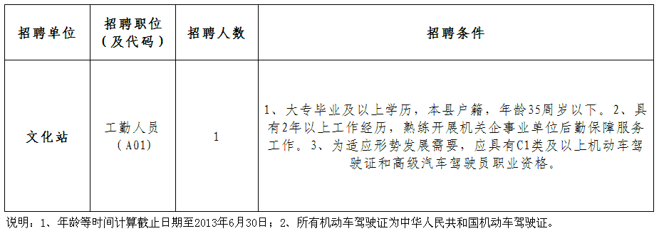 除上述基本條件外,擬招聘崗位具體條件見《龍門縣龍潭鎮文化站2013年公開招聘工作人員職位表》(附表)。