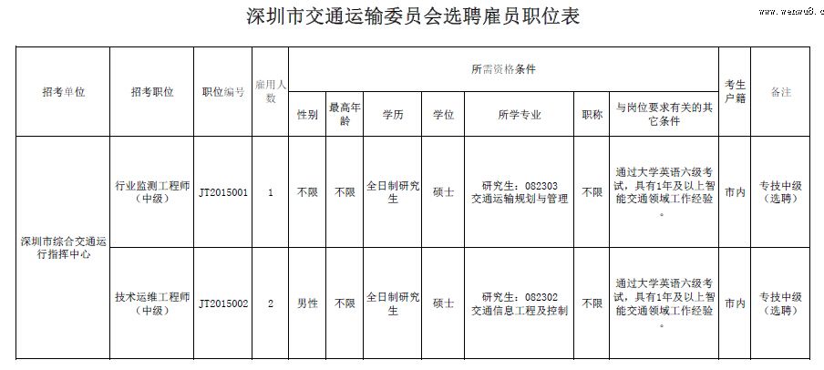 為補充工作人員,根據《深圳市機關事業單位普通雇員招聘實施細則》(深人規〔2009〕4號)有關規定,經市人力資源和社會保障局核準,我委擬選聘專業技術類普通雇員3名,具體職位參見《深圳市交通運輸委員會選聘雇員職位表》(見附件1,以下簡稱《職位表》),現就有關事項公告如下: