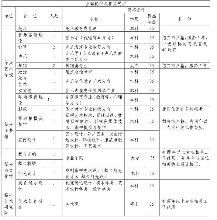 根據(jù)《浙江省事業(yè)單位公開招聘人員暫行辦法》和《紹興市人民政府辦公室關(guān)于加強(qiáng)基層公共文化服務(wù)體系建設(shè)的實(shí)施意見》等有關(guān)規(guī)定,經(jīng)紹興市人力資源和社會(huì)保障局審核,現(xiàn)發(fā)布紹興市文廣局下屬事業(yè)單位藝術(shù)教育管理崗位面向社會(huì)公開招聘工作人員信息,詳細(xì)信息如下: