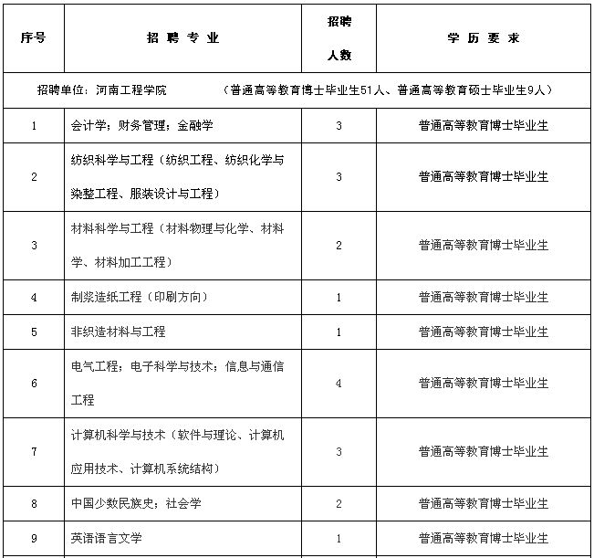 根據(jù)河南省人力資源和社會保障廳《關(guān)于省直事業(yè)單位招聘工作人員有關(guān)具體問題的通知》(豫人社〔2010〕99號)及河南省教育廳《關(guān)于省屬大中專學(xué)校公開招聘人員的試行意見》(豫教人[2008]114號)規(guī)定,我校擬面向社會招聘教師60名,其中博士研究生51名,碩士研究生9名。結(jié)合我校實際,制定本公開招聘方案。
