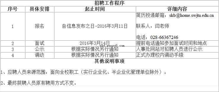 注:簡歷務必使用交大簡歷模板否則無效 西南交通大學戰略發展處(高等教育研究所)面向校內公開招聘報名表 人事處 戰略發展處(高等教育研究所) 2016年3月7日 |