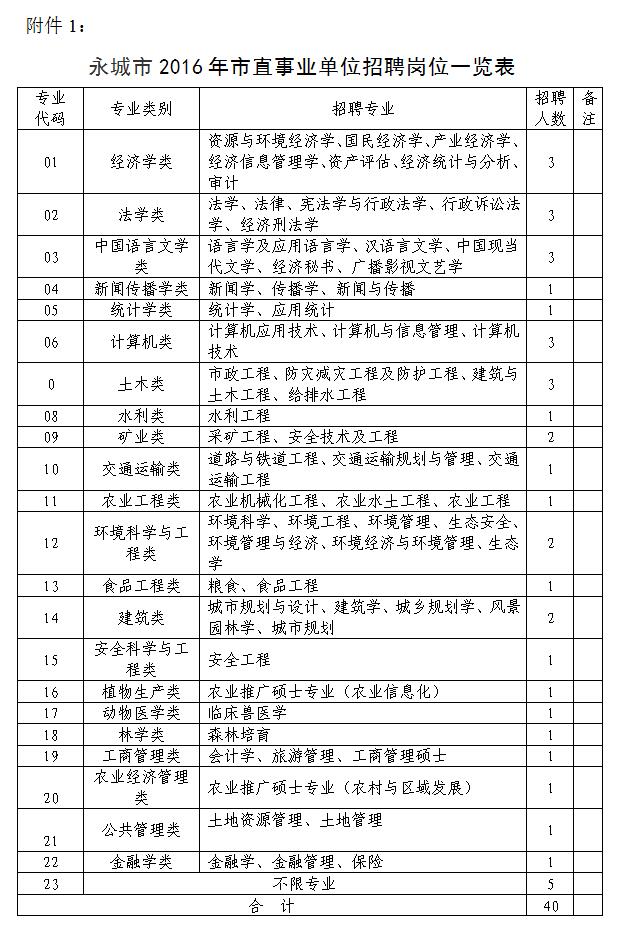 附件1: 永城市2016年市直事業單位招聘崗位一覽表