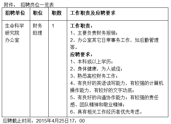 2016年浙江大學生命科學研究院招聘員工公告 本單位擬公開招聘員工 1 名,派遣至浙江大學生命科學研究院從事相關崗位工作,招聘將堅持公開、公平、競爭、擇優的原則,凡符合招聘崗位要求且有意向者,請將個人簡歷(包括學習、工作經歷)以及其它證明材料發至lsi@zju.edu.cn郵箱。經考核后擇優錄取,具體招聘崗位及要求詳見附件。 聯系人:劉老師 聯系電話:0571-88981373