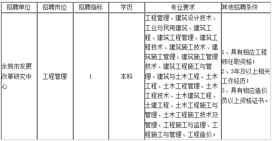 因政府投資項目管理工作需要,經研究并報經有關部門同意,余姚市發展和改革局下屬事業單位擬面向社會公開招聘事業編制工作人員1名。現將招聘有關事項公告如下: