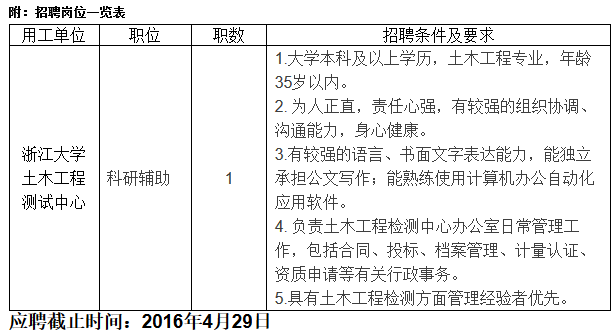 本單位擬公開招聘科研輔助人員1名,派遣至浙江大學土木工程測試中心從事相關崗位工作。招聘堅持公開、公平、競爭、擇優的原則,凡符合招聘崗位要求且有意向者,將請將個人簡歷(包括自大學起的學習、研究和工作經歷)以及其它證明本人能力、水平的相關資料發至電子郵箱jszzc@zju.edu.cn,主題請注明“土木測試中心行政管理人員應聘”)。經面試考核后擇優錄取,待遇面議,具體招聘崗位及要求詳見附件。