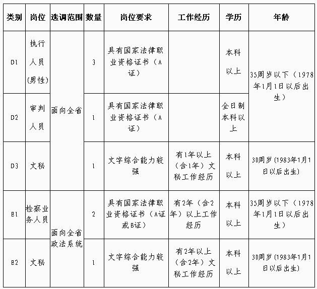 法院:工作人員4名(其中執(zhí)行崗位3名,限男性;審判崗位1名);文秘崗位1名;