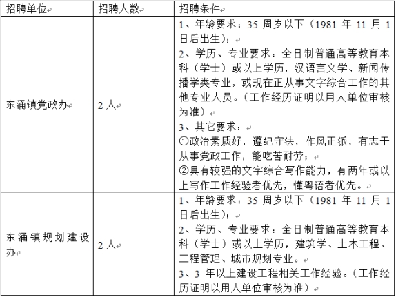 (一)招聘人數(shù):東涌鎮(zhèn)黨政辦公室文字綜合工作人員2名;東涌鎮(zhèn)規(guī)劃建設(shè)辦公室工作人員2名。
