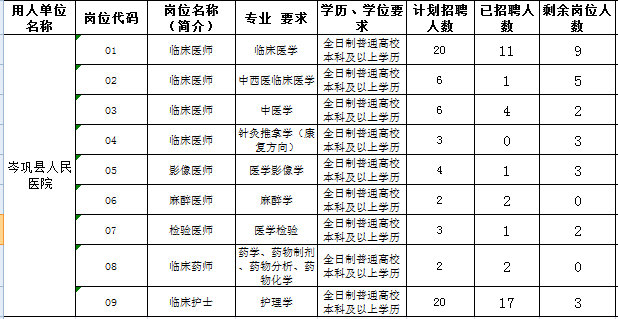 根據《岑鞏縣人民醫院公開招聘66名向社會購買服務編制人員實施方案》要求,我院公開招聘66名向社會購買服務編制人員在貴州醫科大學、遵義醫學院考點報名、資格初審和考試工作已于2017年3月21日結束,經公開招聘66名向社會購買服務編制人員評審小組評審,確定39位同志為聘用對象。現將各崗位在貴州醫科大學、遵義醫學院考點已聘用人數和剩余崗位公布如下: