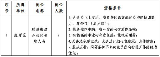 共招聘那洪街道辦社區(qū)專職工作人員2名,具體崗位、招聘人數(shù)及資格條件如下: