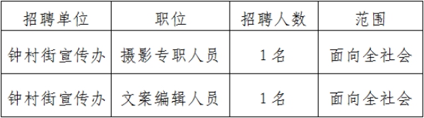鐘村街宣傳辦因工作需要,擬面向社會公開招聘編外合同人員共2名。現將有關事項公告如下: