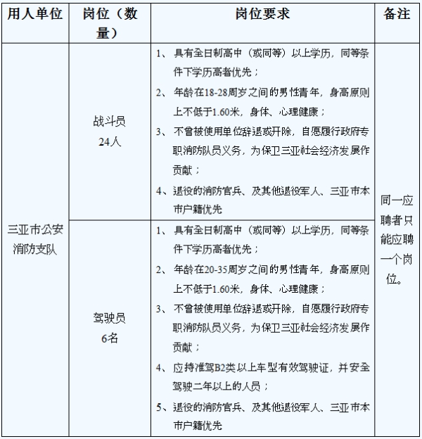 根據(jù)我支隊(duì)用人需求和相關(guān)法律政策規(guī)定,現(xiàn)面向社會(huì)公開招聘30名專職消防隊(duì)員。歡迎符合條件人士積極投身于消防事業(yè)工作,為國(guó)家和部隊(duì)建設(shè)貢獻(xiàn)力量。