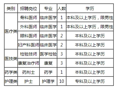 (一)人數和專業:共招聘工作人員23名,其中醫療類6名,醫技類6名,藥學類1名,護理類10名。