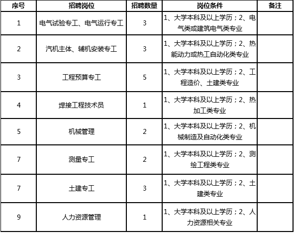 3、專業(yè):主要招聘電氣自動(dòng)化類、熱能動(dòng)力類、工程造價(jià)類、熱加工技術(shù)類、電子信息專業(yè)類、測(cè)繪工程類、機(jī)械制造及自動(dòng)化類專業(yè)、土建類專業(yè)和人力資源專業(yè)。